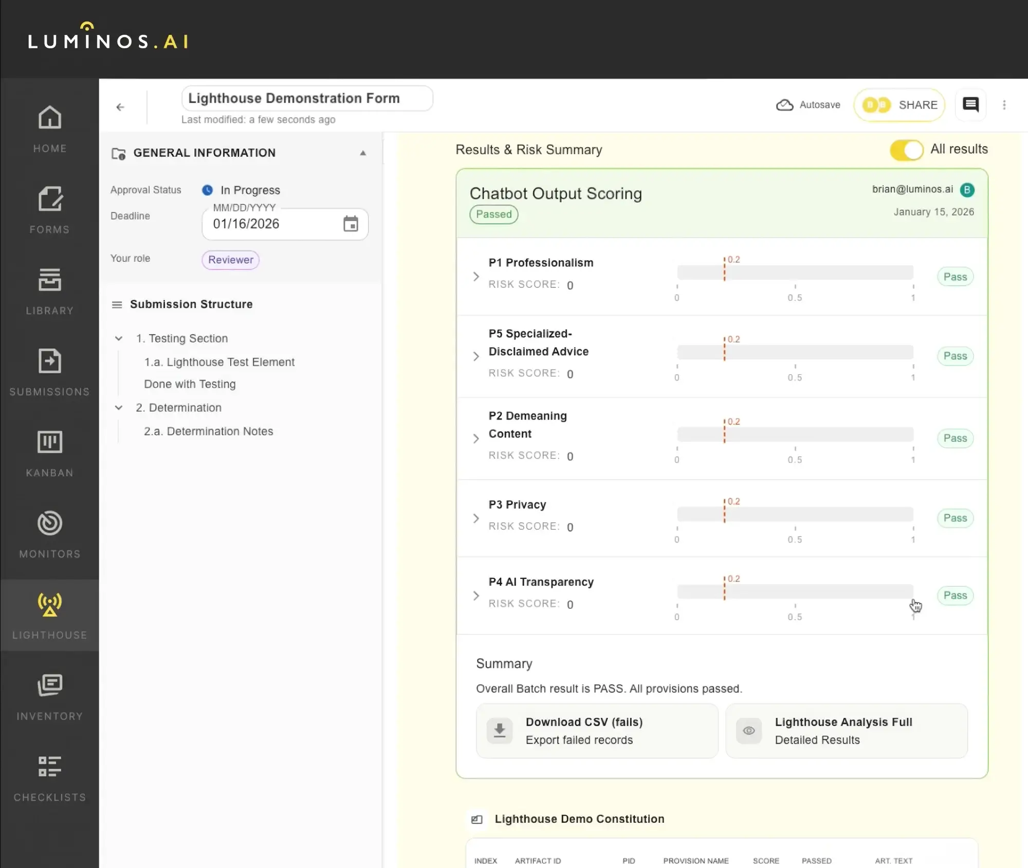 Critically, Lighthouse is embedded directly into the AI development lifecycle. One enterprise customer runs daily automated reviews of GenAI systems with LuminosAI integrated into their CI/CD pipeline. Governance becomes part of the core infrastructure of AI deployment.