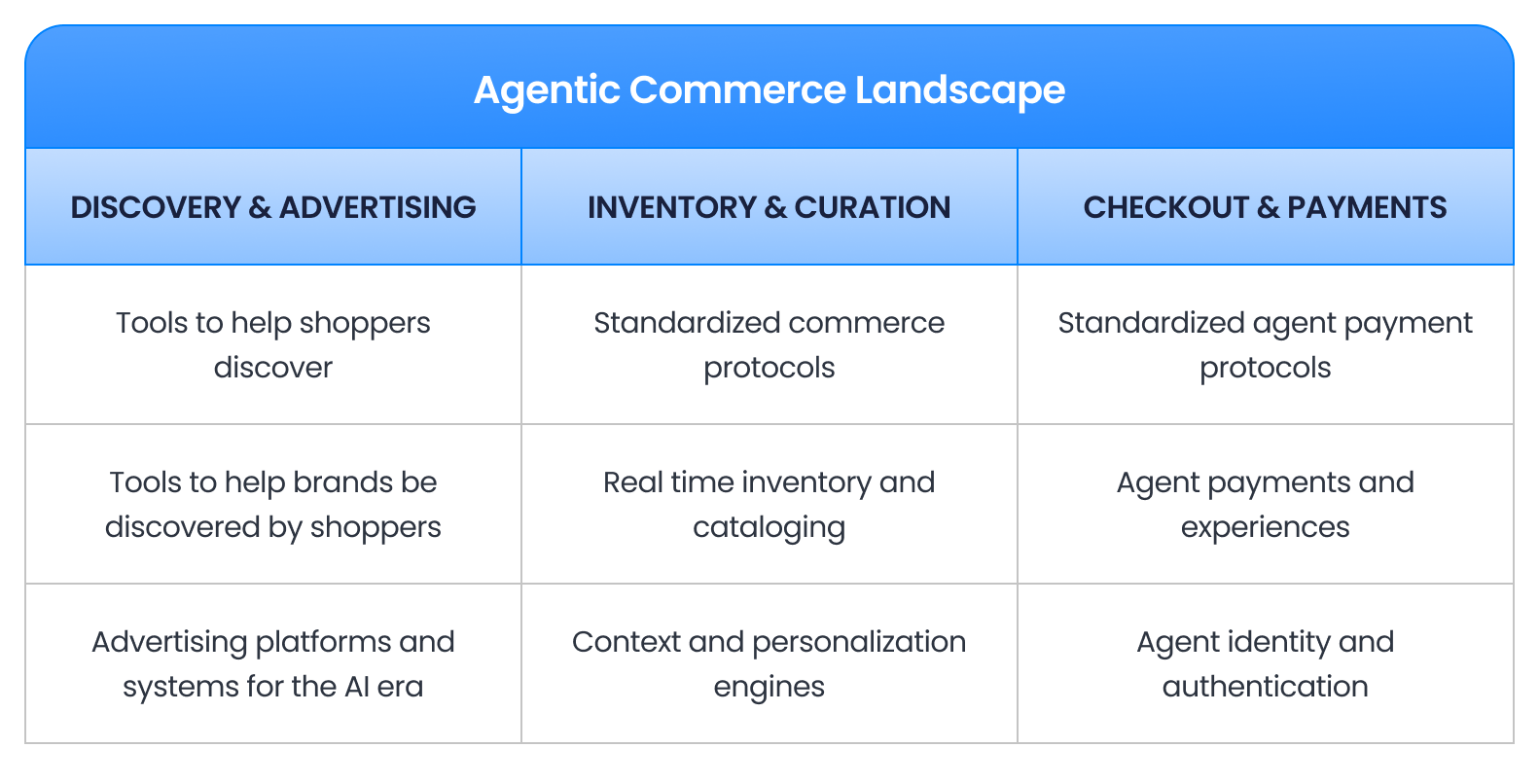 We believe that once again, the opportunity breaks down into three familiar layers: 1) discovery & advertising, 2) inventory & curation, and 3) checkout & payments. The new rails being built will determine how humans and agents transact for years to come.